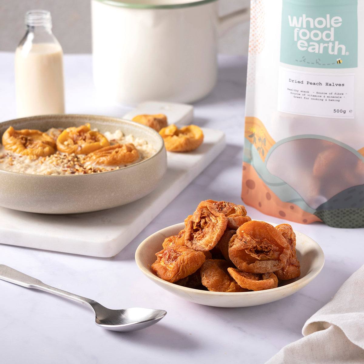 Dried Peaches are good for eating out of hand & adding to granola; or plumped up in breads, porridge, cobblers, cookies, dumplings & pies., Use them to make chutneys, pickles, jams and preserves of distinction, or cook them into stews for some real fruity fulfilment.