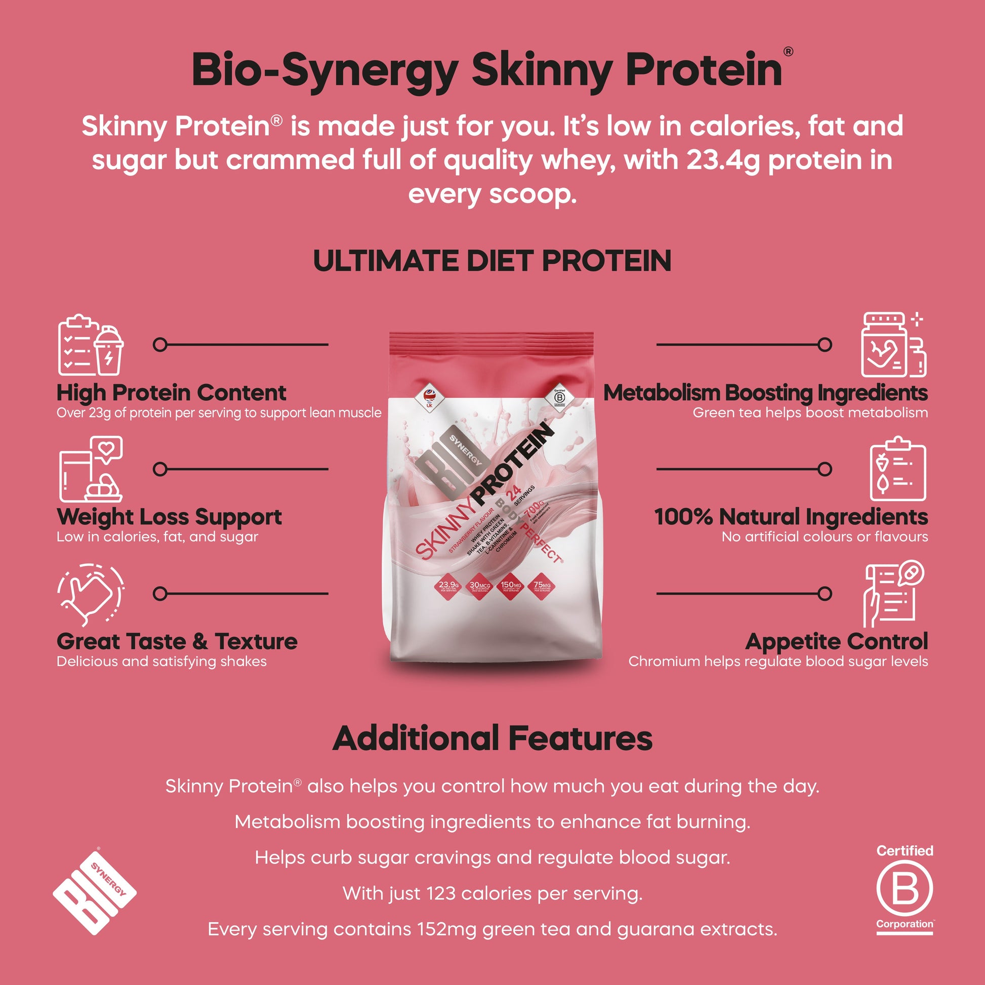 With just 123 calories per serving, Skinny Protein® is the delicious, low fat way to hit your protein intake and weight loss goals. That’s why it was voted no.1 for weight loss by independent review sites and Your Fitness Magazine.