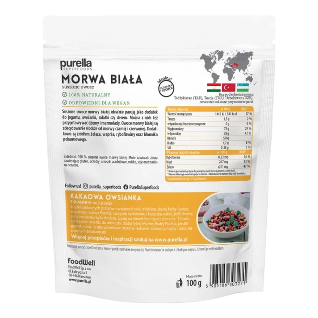 Dried white mulberry fruits are perfect as an addition to yogurt, oatmeal, salad or dessert. You can also use them to prepare jams and marmalades. White mulberry fruits are definitely sweeter than black and red mulberries. In addition, they are a source of iron, calcium, riboflavin and dietary fiber.